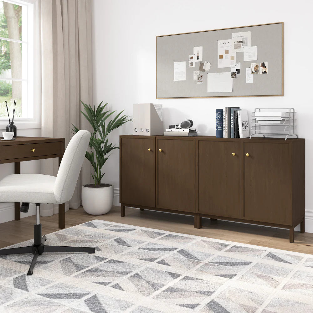 Bring balance and versatility to your home with the Bush Home Avery 2 Door Low Storage Cabinet – Set of 2. Crisp shaker doors, modern post legs, and two included knob finish options in each cabinet box create a composed, architectural profile that transitions effortlessly between living spaces. Crafted from birch veneer, engineered wood, and solid poplar legs, each cabinet highlights natural wood variation that lends warmth and character. Soft-close doors open to reveal flexible shelving that keeps items neatly concealed, while the tops provide space to display decor or everyday essentials. Designed to align seamlessly for a modular configuration, this pair offers cohesive storage with a tailored aesthetic. Each piece is one of a kind — and pairs perfectly with the full Avery collection.