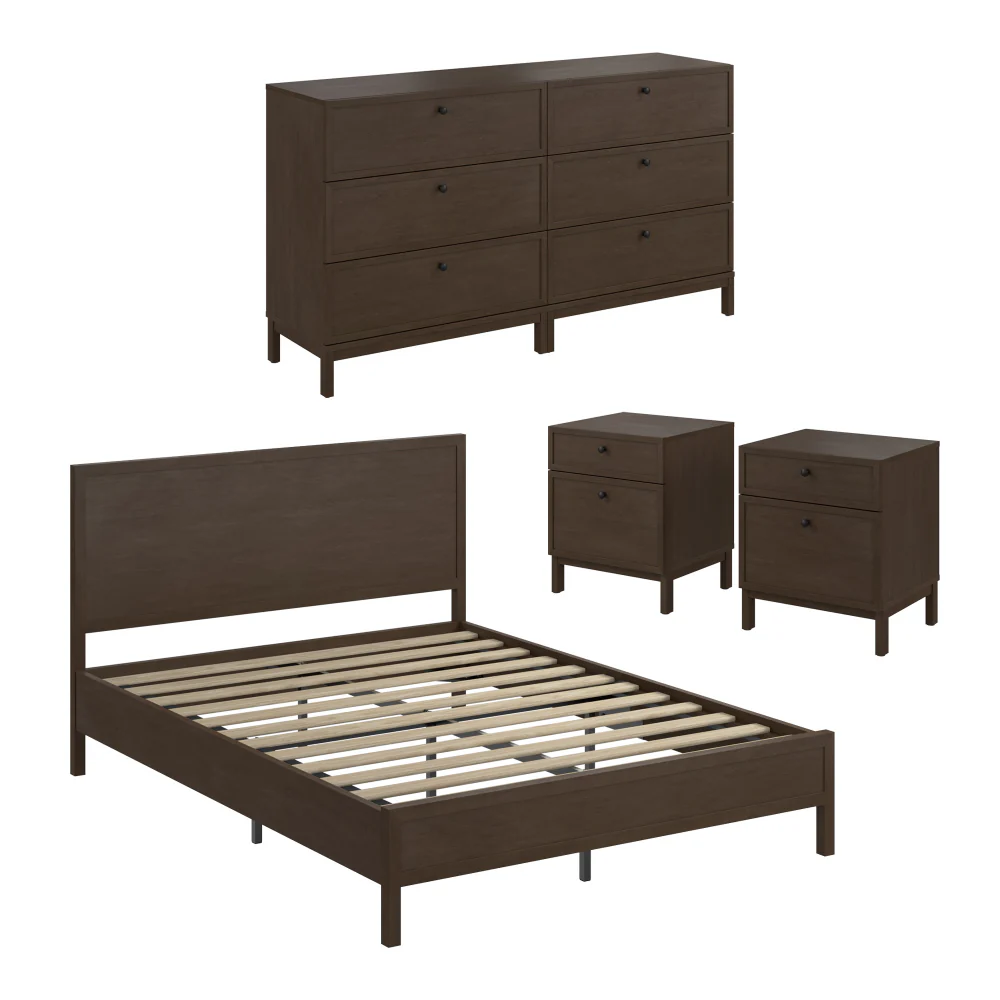 Bring structure, balance, and cohesive style to your bedroom with the Bush Home Avery Queen Platform Bed with 3 Drawer Dresser and Nightstand Set. Defined by crisp shaker lines, elevated post legs, and two included knob finish options for customizable style on the dresser and nightstand, each piece feels modern yet timeless. Crafted from birch veneer, engineered wood, and solid poplar legs, the collection showcases natural wood variation that adds quiet character and warmth. The reinforced platform bed creates a dependable foundation, while the dresser’s spacious drawers and coordinating nightstands provide practical storage for clothing and bedside essentials. The dresser features flat side panels for modular placement, allowing it to nest seamlessly beside additional units as your space evolves. Each piece is one of a kind — and pairs perfectly with the full Avery collection.